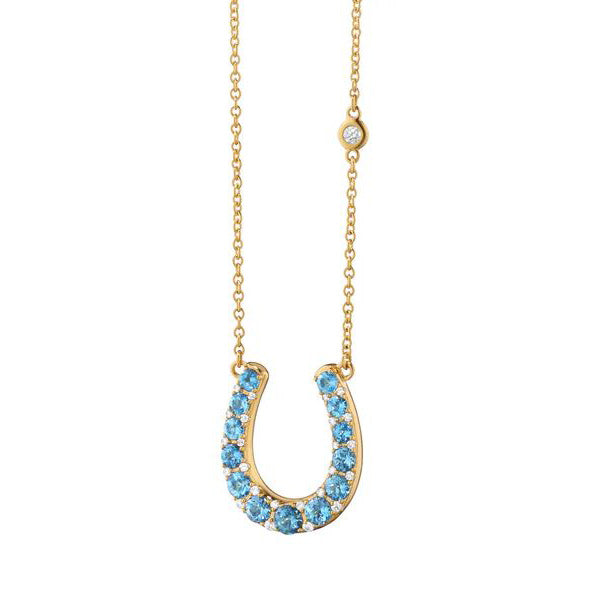 Bringing you good fortune and luck, this 18k yellow gold horseshoe necklace features brilliant cut aquamarine stones and white diamond accents. A beautiful statement piece, worn short, to inspire you. Aquamarine stones hand selected for exceptional color.