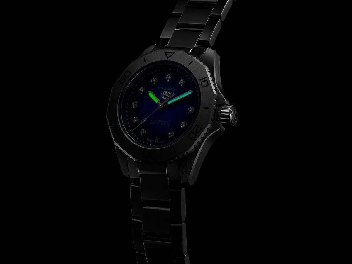 This versatile TAG Heuer Aquaracer is an incentive for going beyond the limits, with tremendously robust construction and unparalleled boldness of design. With 11 VS diamonds (0.107 ct), this is a watch made to take up a challenge.